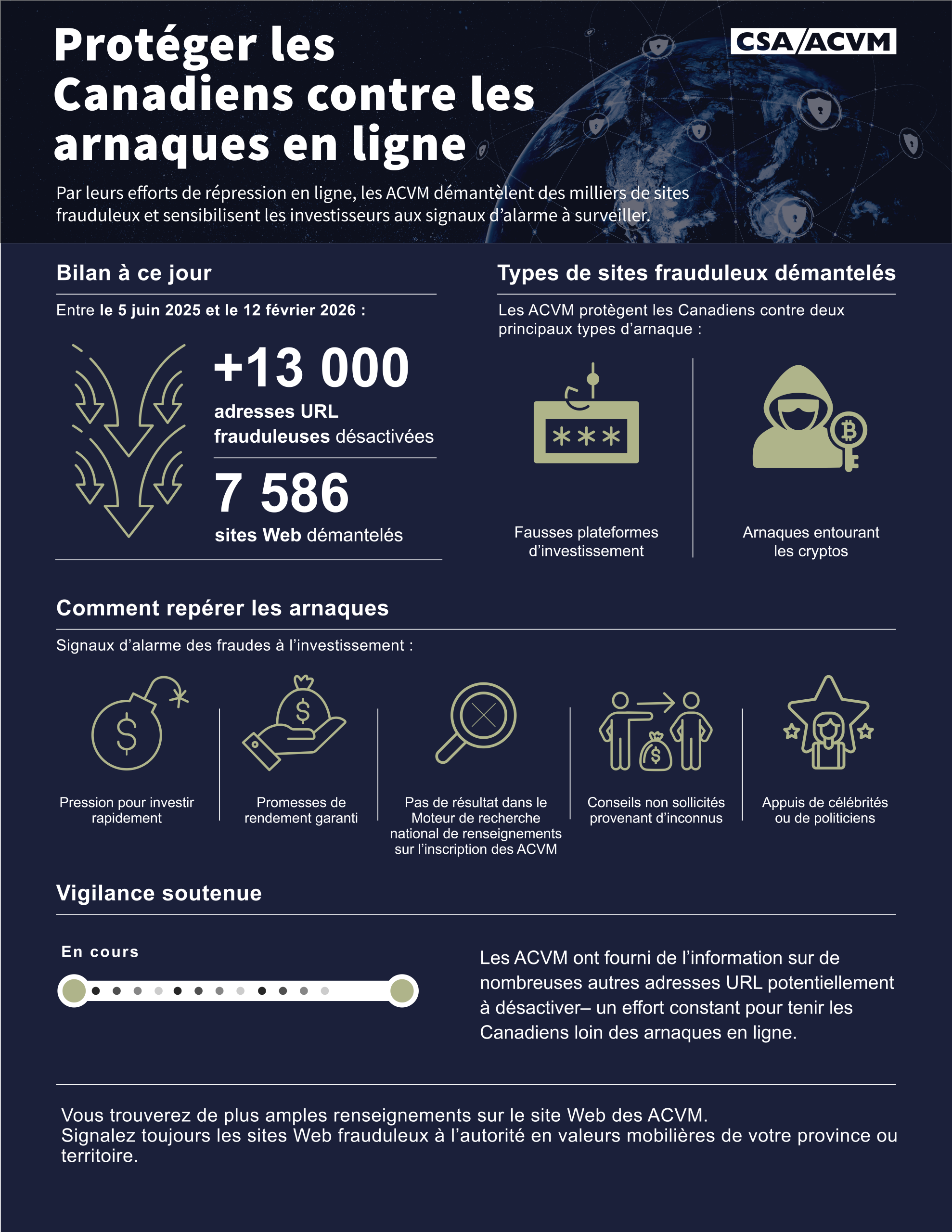 Entre le 5 juin et le 12 février 2026, les Autorités canadiennes en valeurs mobilières (ACVM), en collaboration avec l’Organisme canadien de réglementation des investissements (OCRI), ont neutralisé 7 586 fausses plateformes d’investissement et sites Web de cryptomonnaie frauduleux de même que plus de 13 000 adresses URL distinctes qui y étaient liées.