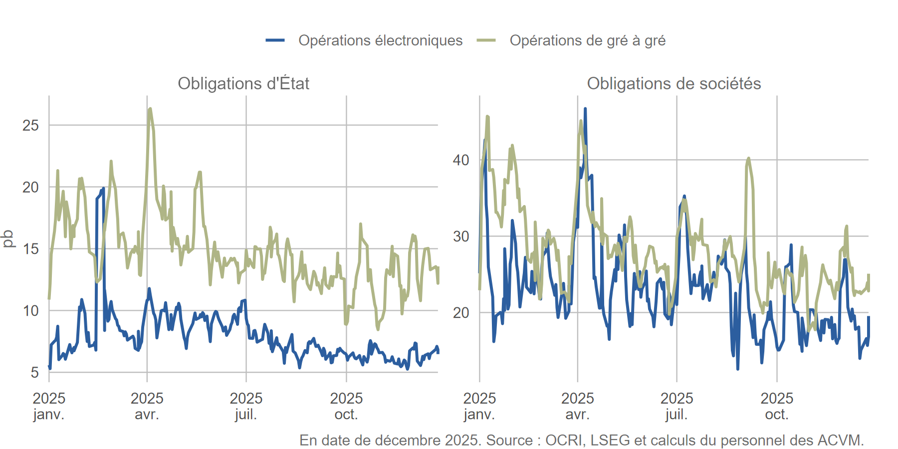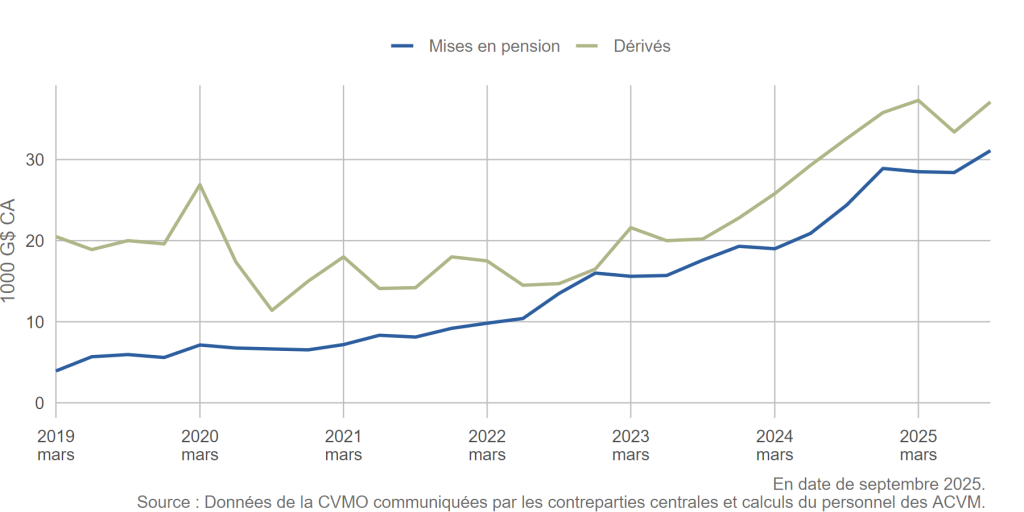Le marché canadien des dérivés de gré a progressé de façon constante en 2025. Cette expansion est en majeure partie attribuable aux dérivés sur taux d’intérêt, principalement en raison des activités de gestion des risques et du remplacement du taux CDOR par le taux CORRA comme indice de référence en 2024.