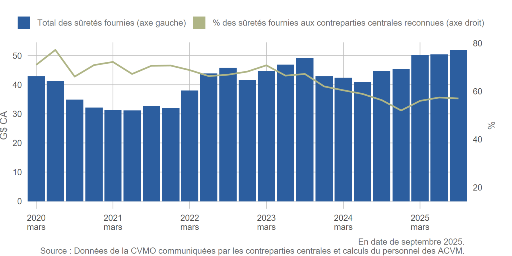 L’activité de compensation poursuit sur sa lancée des dernières années au Canada[8]. Au troisième trimestre de 2025, la valeur notionnelle des dérivés compensés a atteint 37 billions de dollars, en hausse de 14 % par rapport au trimestre correspondant de 2024. L’activité de compensation des mises en pension de titres à revenu fixe a progressé de 27 % au cours de cette période (figure 1). Le montant total des exigences de sûretés, lequel reflète mieux l’exposition au risque des participants aux contreparties centrales, se chiffrait à environ 52 milliards de dollars à la fin du troisième trimestre de 2025, une augmentation de 16 % sur le trimestre correspondant de l’exercice précédent portée par l’accroissement de la volatilité et de l’activité de compensation (figure 2).