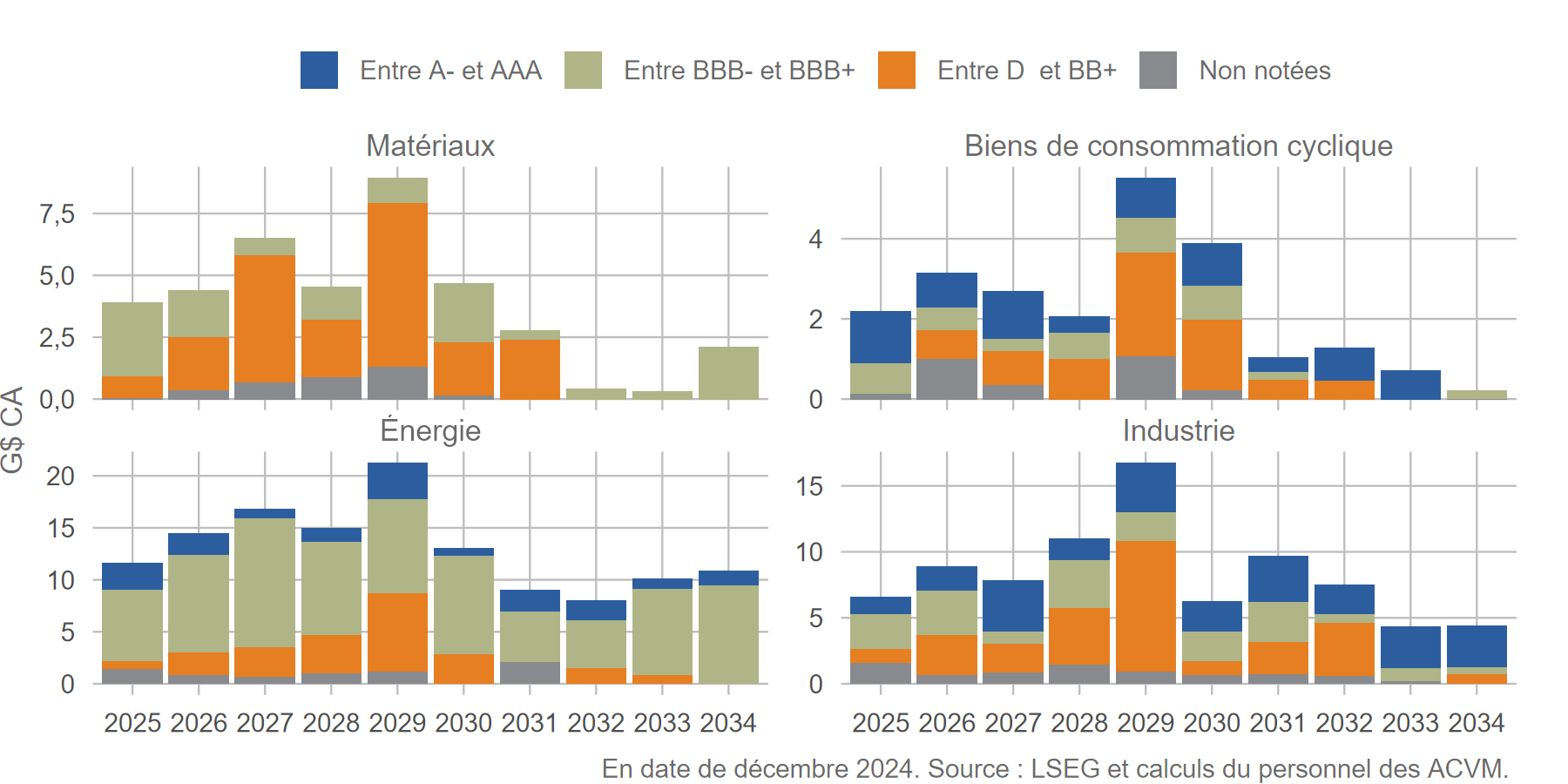 Au deuxième trimestre de 2025, le refinancement a engendré de fortes tensions dans les secteurs de l’industrie – particulièrement manufacturier – et des biens de consommation cyclique. Les sociétés en cause ont émis énormément de titres de dette pour renouveler les obligations arrivant à échéance. Cette pression devrait s’accentuer en 2026, car davantage de sociétés émettrices d’obligations à rendement élevé devront les refinancer (figure 4).Les secteurs des matériaux et de l’énergie rencontrent des difficultés similaires, mais sont en meilleure posture grâce à la vigueur de la demande mondiale. En outre, une nouvelle aide gouvernementale a été annoncée dans le budget fédéral de 2025[15]. Quoi qu’il en soit, la nécessité de refinancer ou de restructurer la dette en contexte d’incertitude pourrait contrarier la capacité des entreprises d’honorer leurs obligations si les politiques commerciales changeaient ou si les humeurs du marché occasionnaient une hausse des coûts d’emprunt.