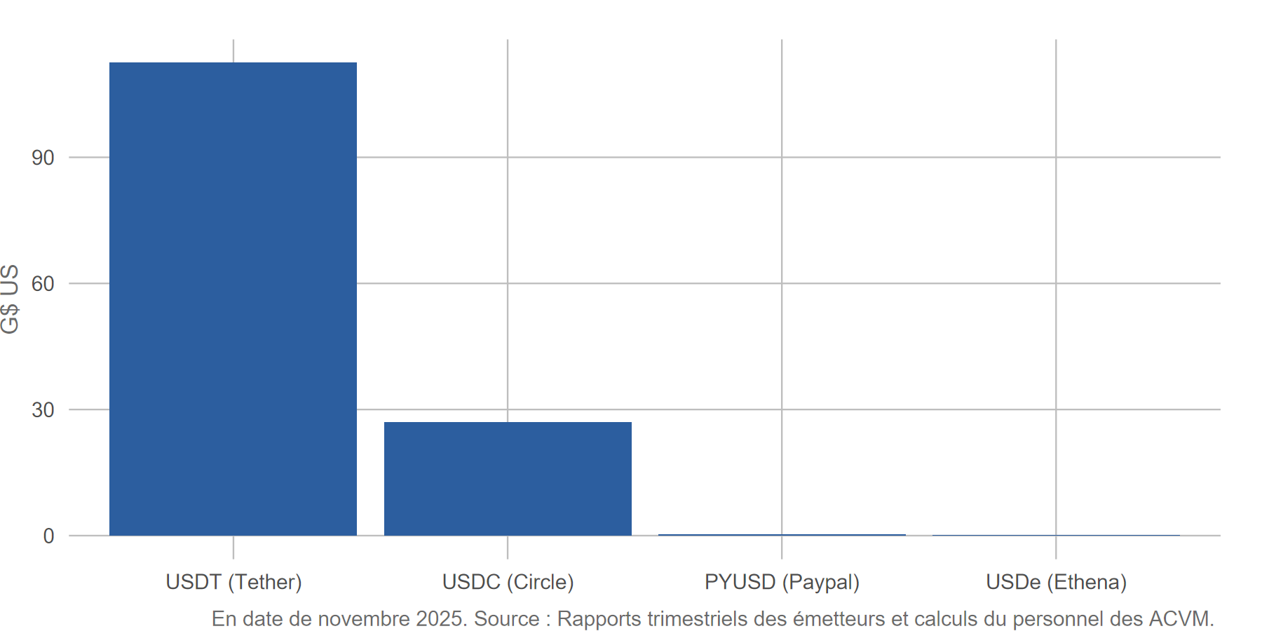 Aujourd’hui, les jetons stables sont incontournables dans l’écosystème des cryptoactifs. Leur capitalisation boursière mondiale combinée dépasse les 300 milliards de dollars US, soit autour de 10 % de l’ensemble du marché des cryptoactifs. Deux émetteurs, USDT (Tether) et USDC (Circle), possèdent près de 90 % du marché des jetons stables. Conçus initialement pour fournir de la liquidité sur les plateformes de cryptoactifs, les jetons stables servent aujourd’hui à soutenir la finance décentralisée, à garantir des dérivés à titre de sûreté, à régler des paiements internationaux et à faciliter les transactions au détail.