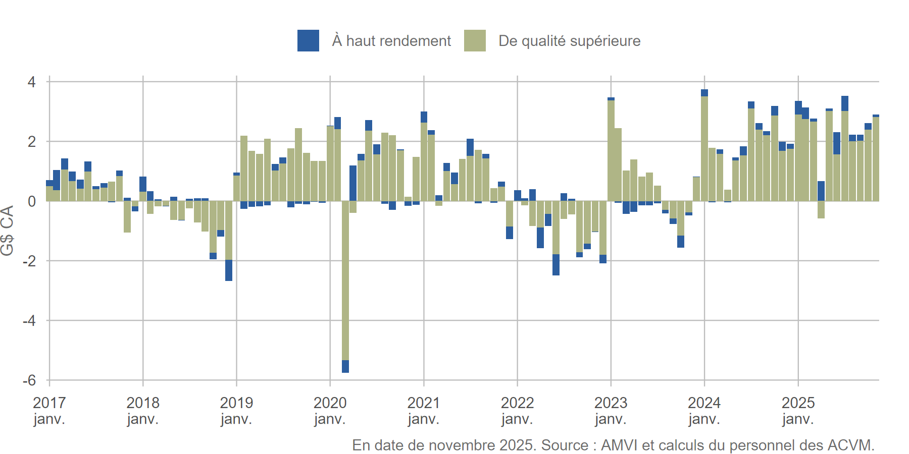 Malgré la baisse des taux d’intérêt, les OPC marché monétaire ont enregistré des entrées nettes en 2025. En 2024, ils s’étaient adaptés à la disparition du marché des acceptations bancaires. Selon une analyse récente de la Banque du Canada, ces OPC ont réagi en augmentant leur exposition au papier commercial[20]. Les estimations préliminaires du Comité indiquent qu’une grande partie de cette augmentation est attribuable au papier commercial adossé à des actifs, et celui-ci représente maintenant le quart du total de l’actif net des OPC marché monétaire.