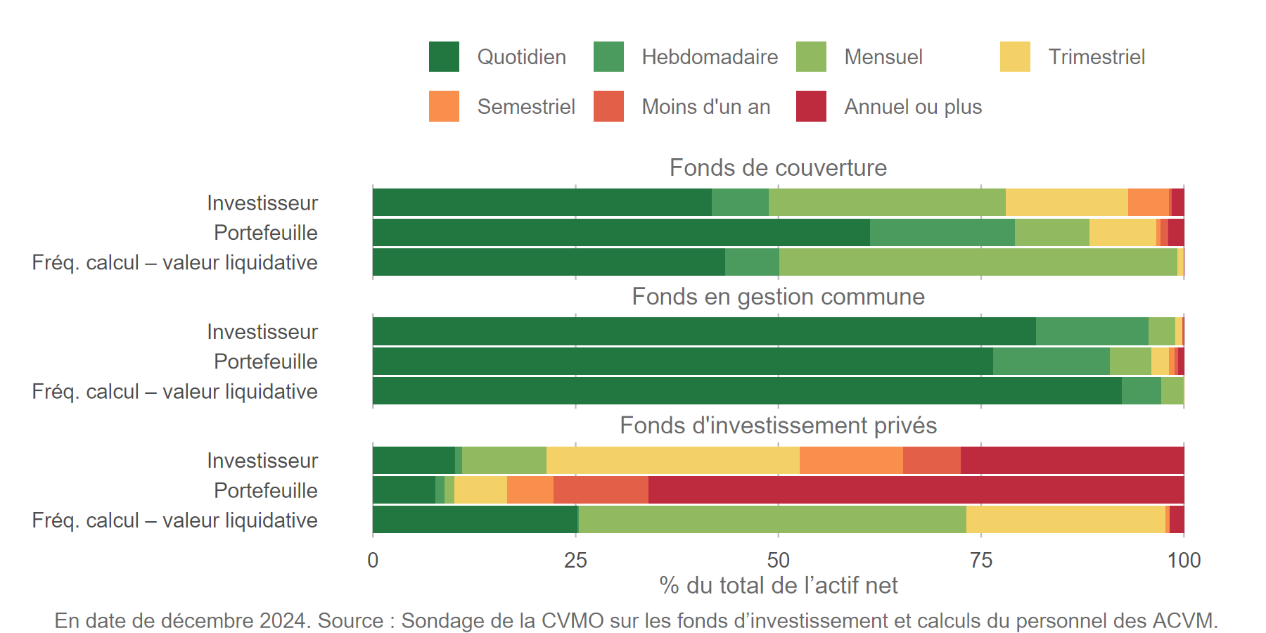 [24] Les « entités assimilables à des fonds d’investissement privés » investissent également dans la dette privée (comme des prêt hypothécaires), le capital-investissement et l’immobilier, et permettent les rachats. Il n’existe aucune donnée financière structurée relatives à ces entités, car leurs partssont habituellement émises par des courtiers sur le marché dispensé qui, contrairement aux gestionnaires de fonds d’investissement, ne sont pas appelés à remplir le sondage de la CVMO sur les fonds d’investissement.
